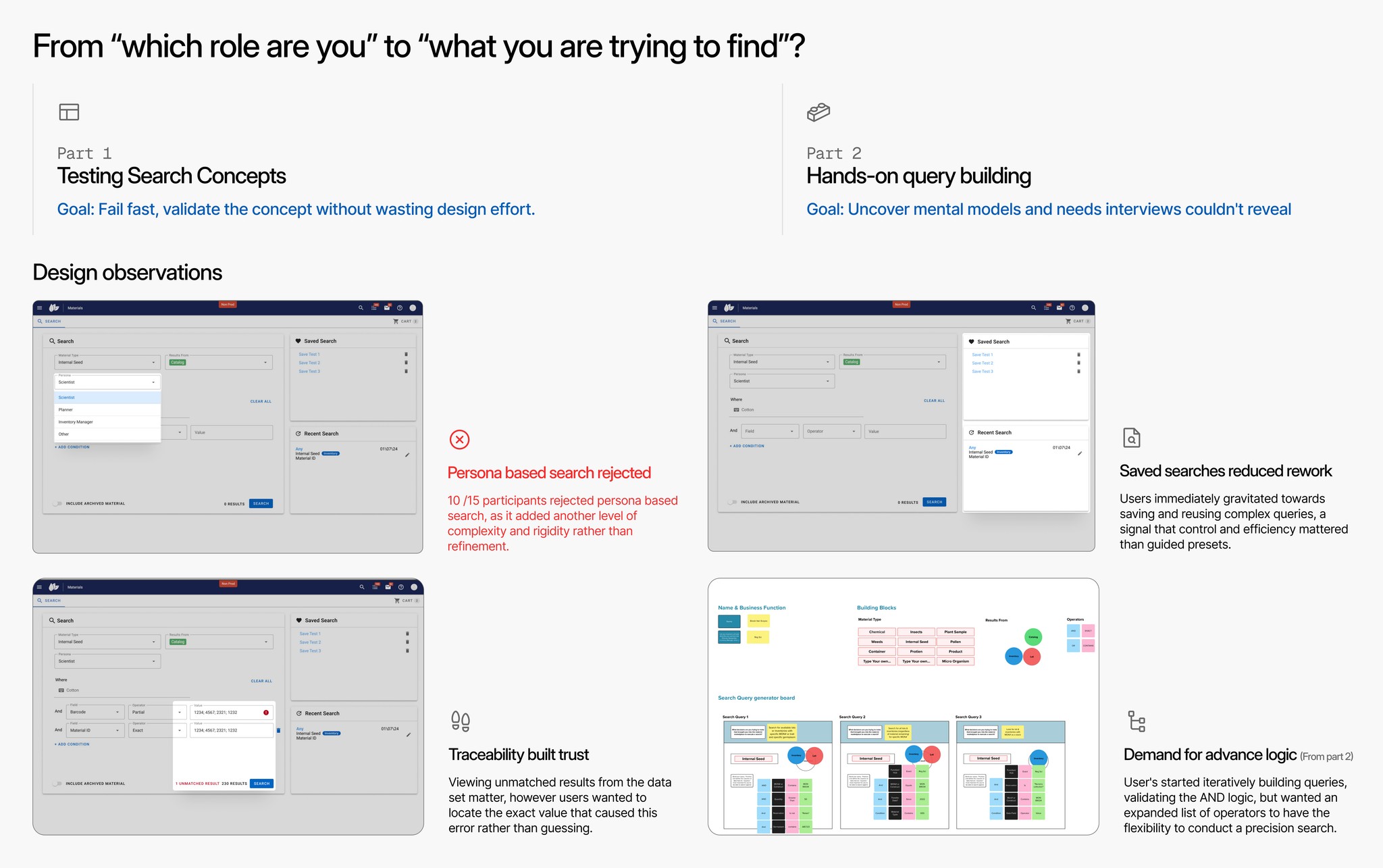 Cross-functional interviews with 20+ users helped uncover where trust eroded and clarified which search capabilities were essential to include in the MVP.
