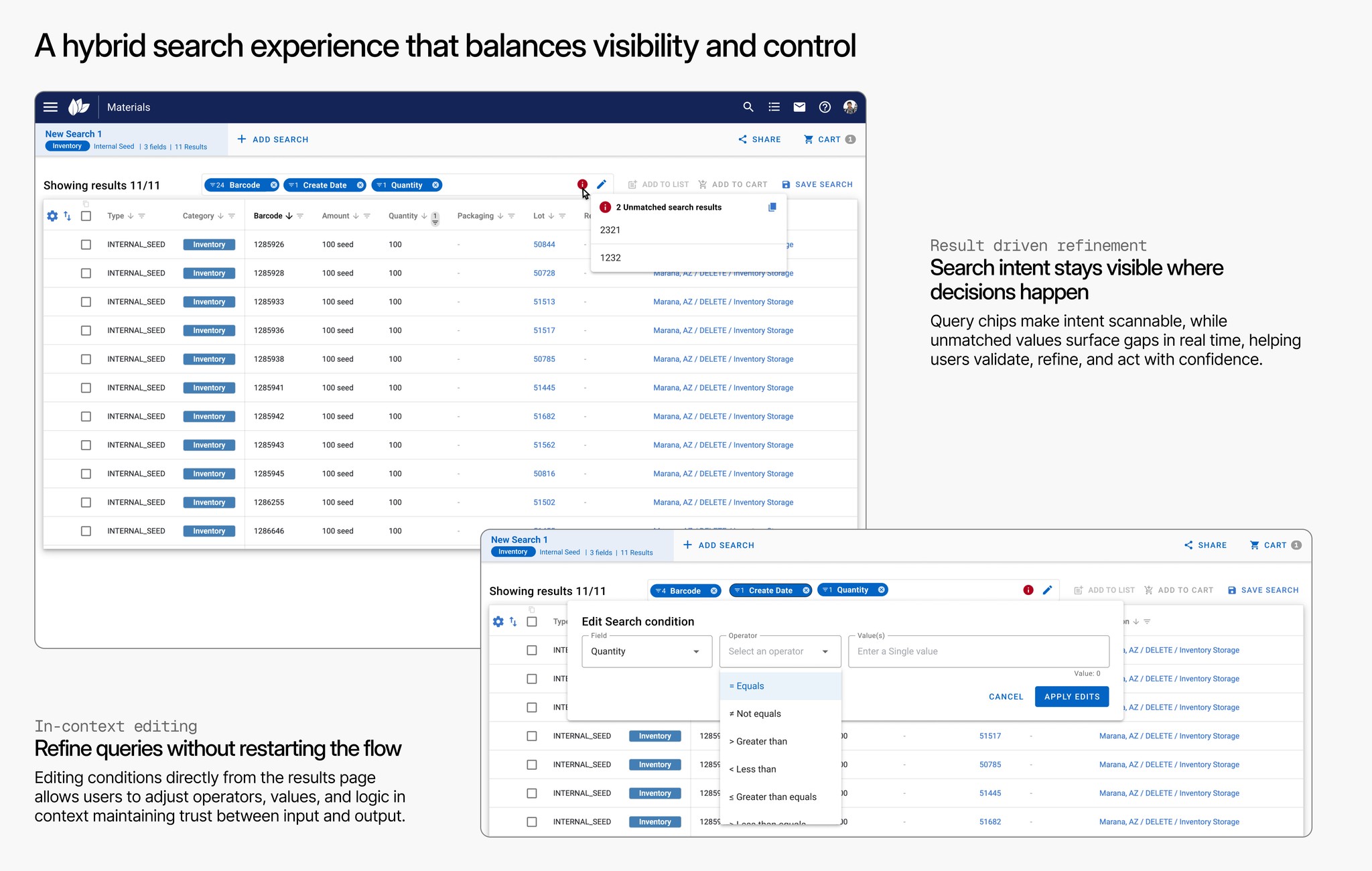 From focused query building to editable results, every interaction prioritizes user control and visibility.