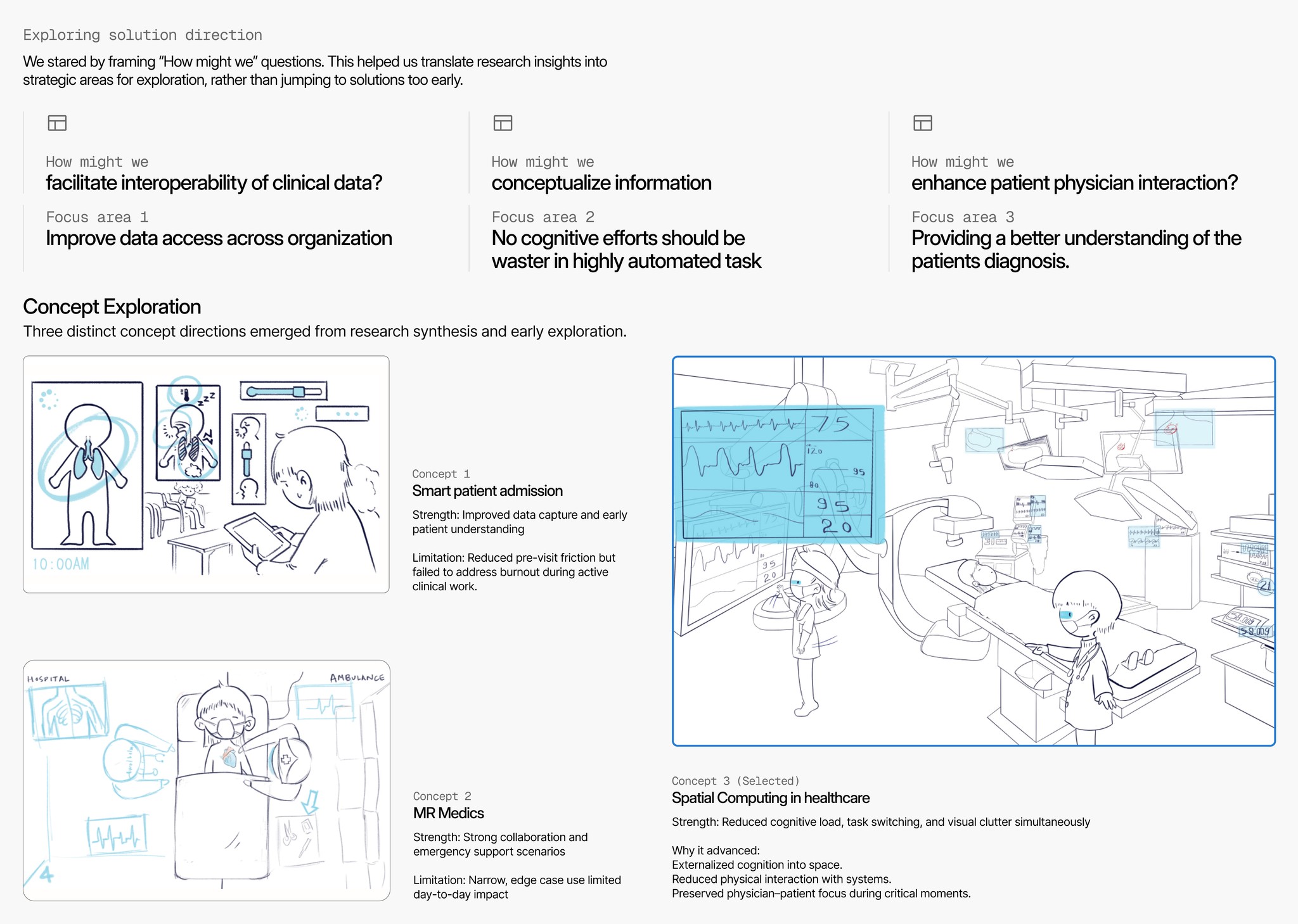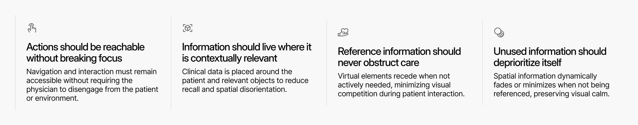 Mapping these workflows clarified where physicians lose time and focus during care, and guided the creation of a single spatial interaction model that adapts across contexts without adding complexity.