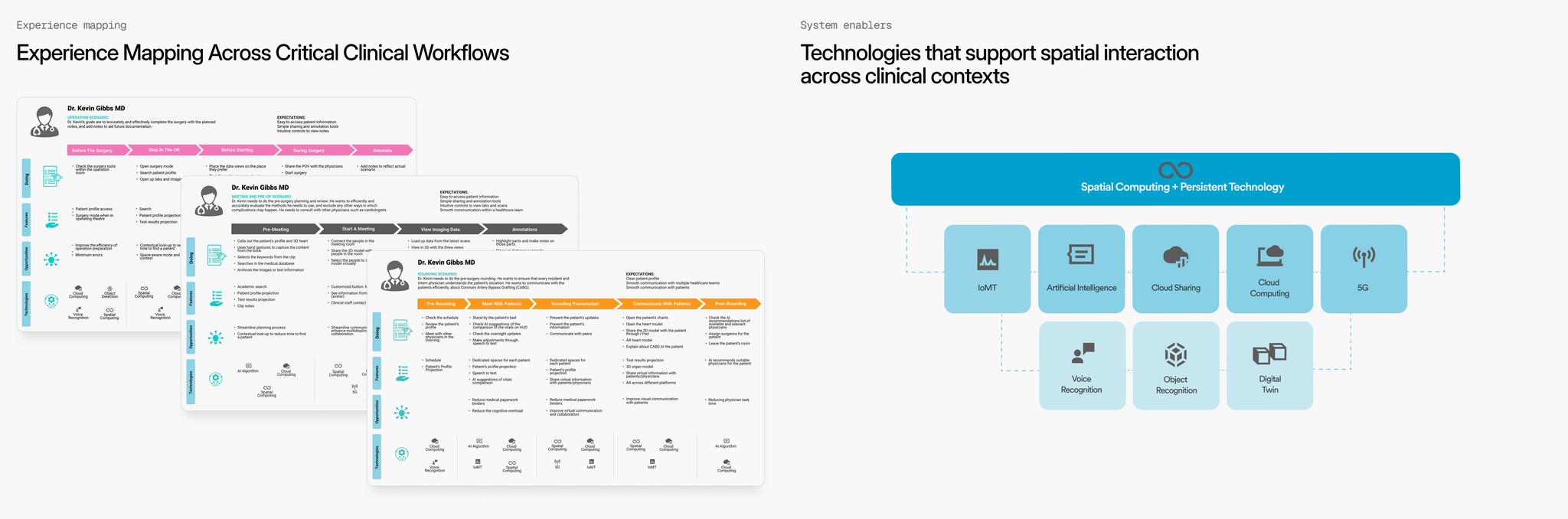 To design a spatial system that could scale across clinical environments, we mapped physician workflows across three high-impact scenarios, rounding, collaborative planning, and surgery, and identified the shared system foundations required to support them.
